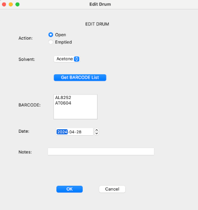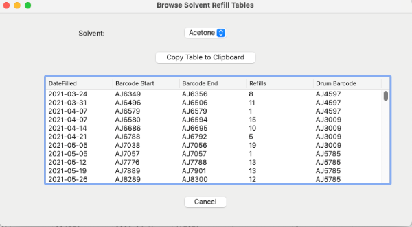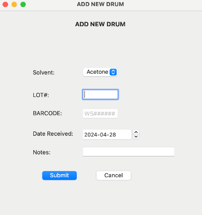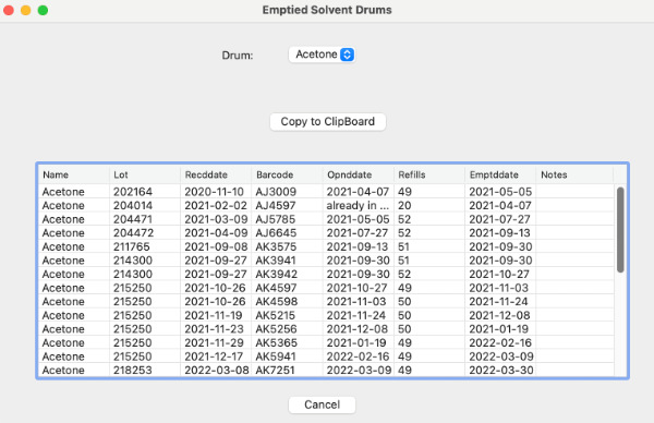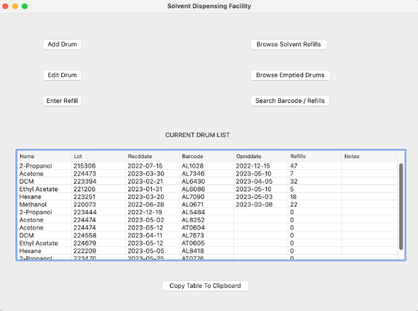 I started keeping track of the drums and the refills in a spreadsheet (see the Coding/VBA page) but knew I needed to have a better system. I took the data from the spreadsheet and converted it into a SQLite database. Then I built an app around it to be able to easily enter the drum information and perform various data searches.